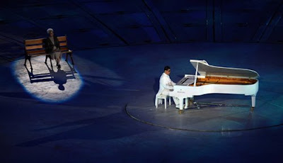 The cauldron is lit by Chinese Athletics athlete Hou Bin.